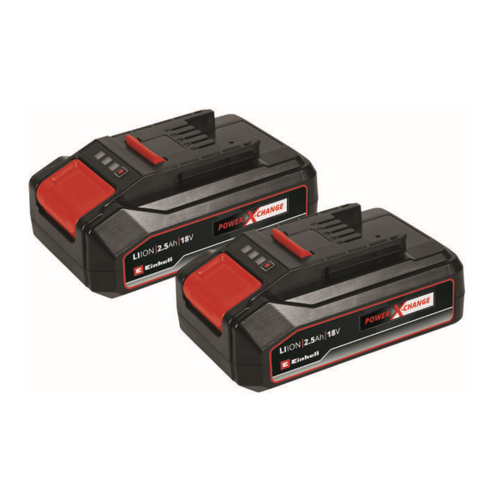 Le 2 batterie Einhell da 18V 2,5 Ah Power X-Change PLUS appartengono al sistema di batterie intercambiabili e combinabili Power X-Change di Einhell.