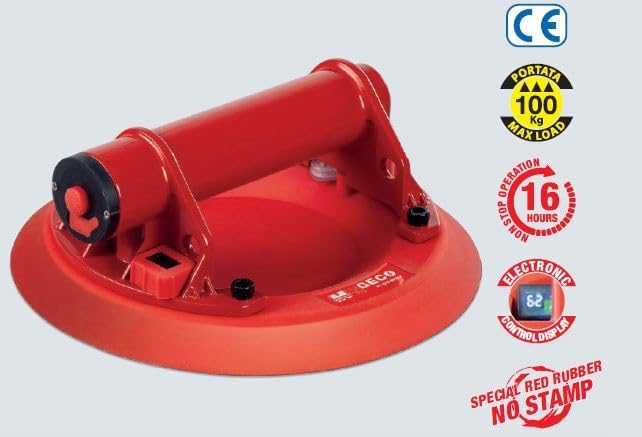 GECO E-POWER è una ventosa alimentata a batteria, mantiene la sua aspirazione fno a 16 ore (a batteria completamente carica) ed ha una portata orizzontale massima di 100 kg. Il sensore di sicurezza integrato rileva il livello di vuoto e automaticamente si attiva per mantenerlo costante.