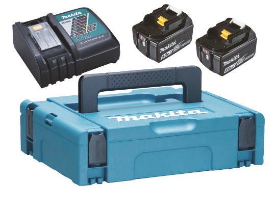 - Una valigetta Makpac contenente due batterie Li-Ion da 5,0Ah con indicatore di livello batteria e un caricabatterie rapido DC18RC che carica una batteria in 45 minuti.