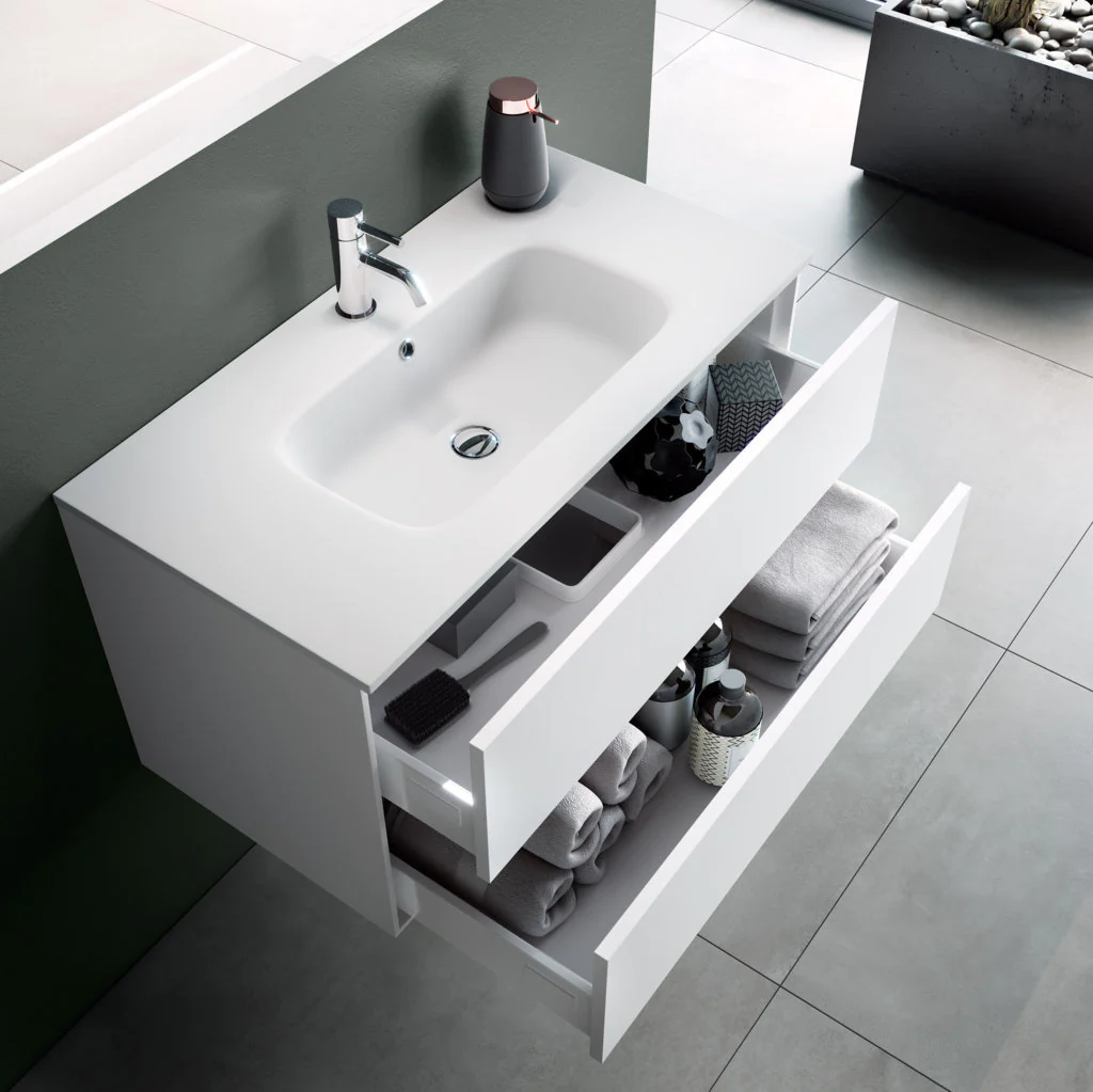 La composizione LUNA 120 cm è composta da una base a due cassetti con chiusura a scorrimento soft close con maniglie in alluminio bianco opaco, in melaminico antigraffio colore BIANCO LACCATO LUCIDO, un lavabo in ceramica con foro troppo pieno, uno specchio con telaio in alluminio satinato con lampada integrata LED a luce naturale da 4500 K, led 2835, 60 LED/m, 10 W, AC 220/240 V, 50-60 Hz, 1200 lumen, IP 44, RoHS, CE, classe energetica A++.