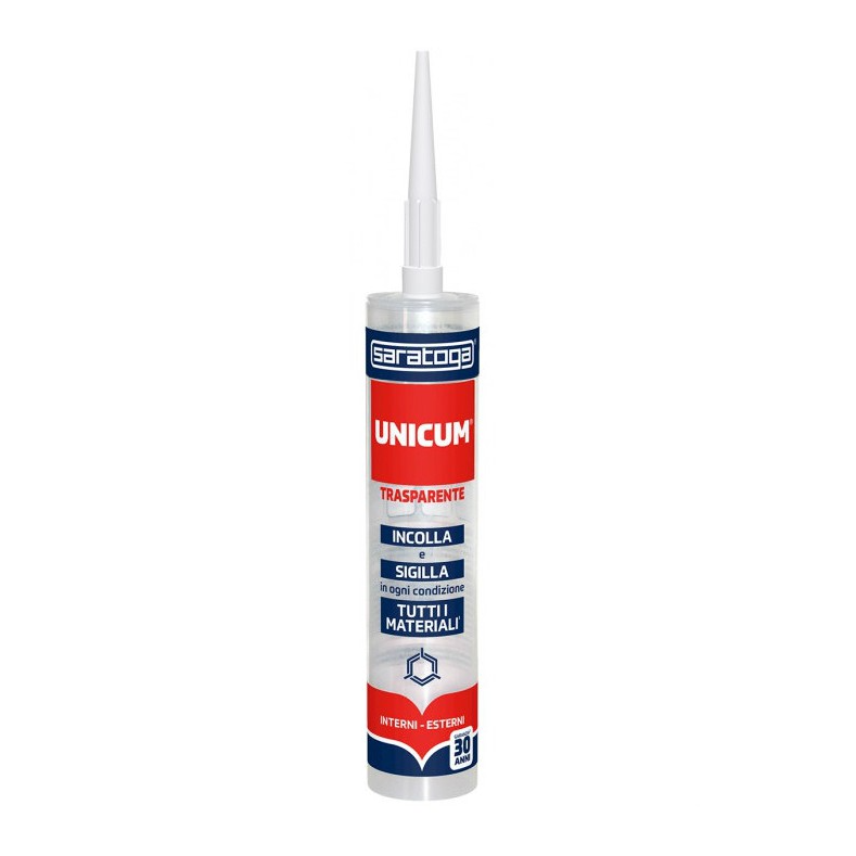 Saratoga UNICUM Trasparente è un adesivo di alta qualità per utilizzo universale, per tutti i materiali e per tutte le condizioni. A base di polimeri ibridi, è senza solventi, isocianati e ftalati, è inodore, ha ottimo potere riempitivo, mantiene elevata elasticità nel tempo ed è sovraverniciabile una volta asciutto.