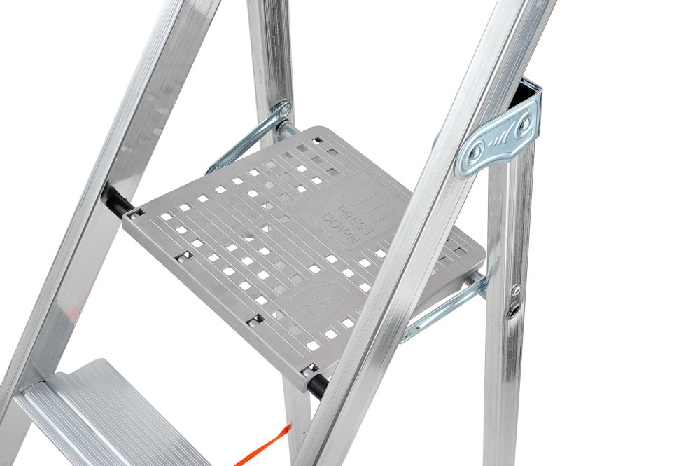 La Scala domestica Gierre Stabila AL710 ha la piattaforma (260×260 mm) in alluminio, si blocca in sicurezza con la sola pressione della mano. Il gradino è particolarmente comodo, +40% rispetto alle scale sul mercato: addirittura 11 cm!